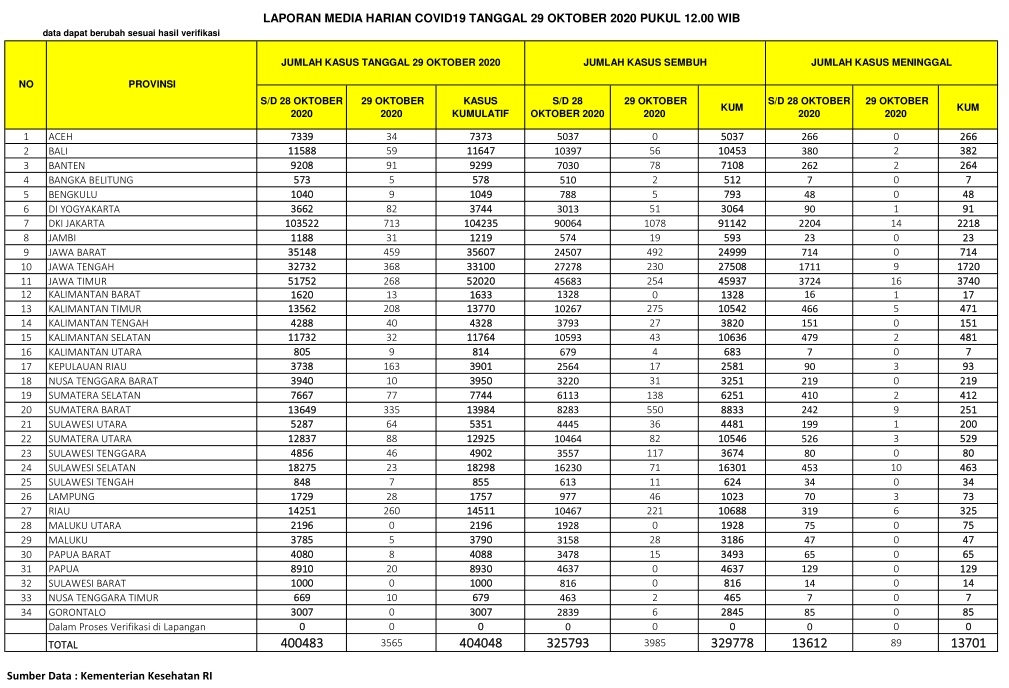 PEKANBARU – Kasus positif virus Corona (Covid-19) di Indonesia hari ini, Kamis  (29/10/2020), bertambah 3.565 orang. Dengan penambahan tersebut, total kasus positif virus Corona di Indonesia menjadi 404.048 orang.