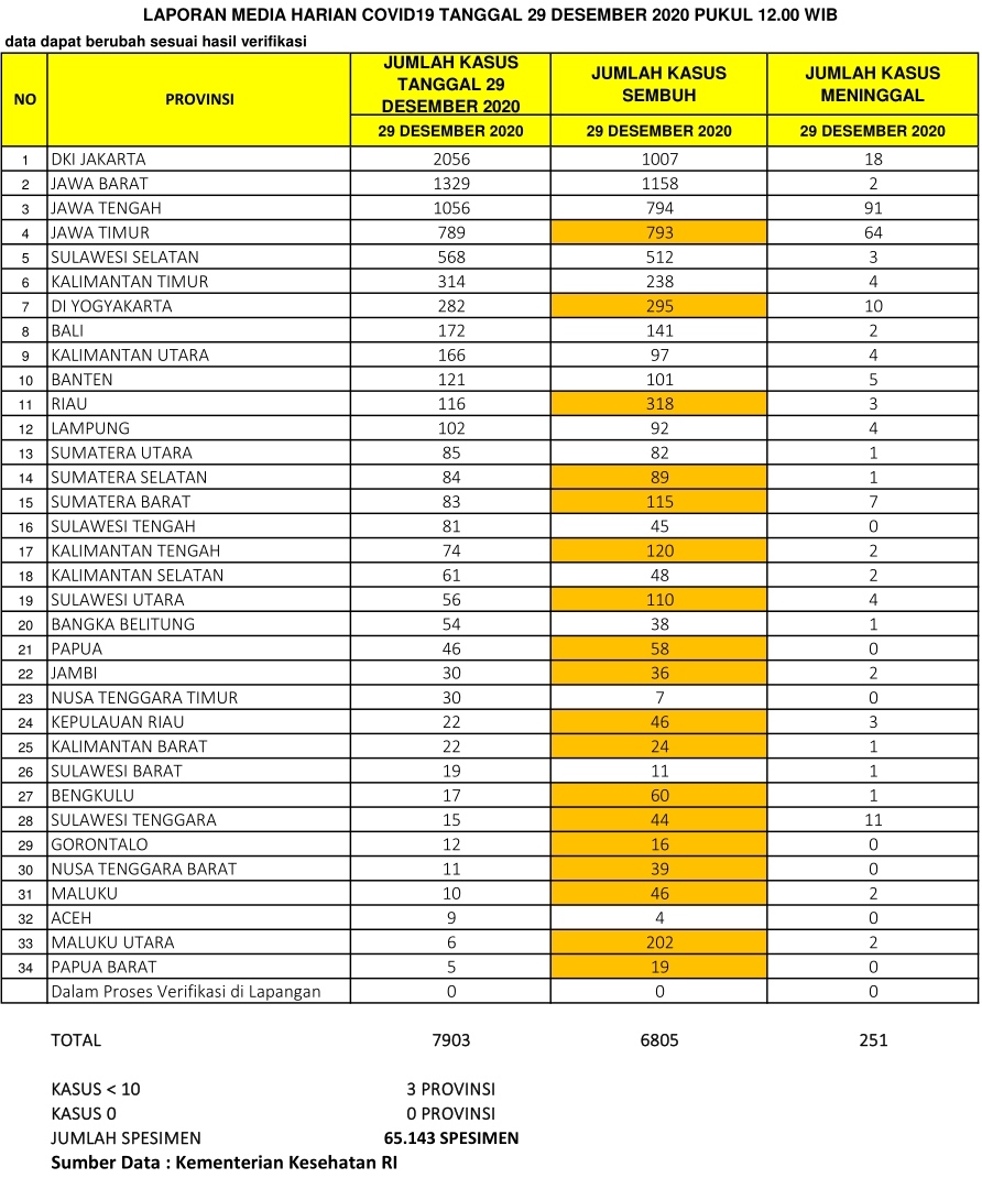 Berikut sebaran 7.903 kasus baru Corona di Indonesia, Selasa (29/12/2020):