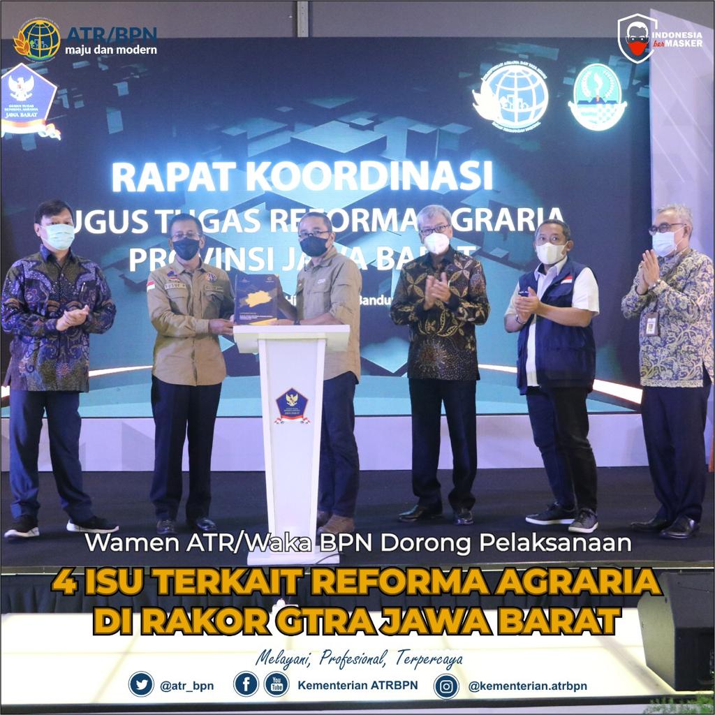 Direktur Jenderal Penataan Agraria Kementerian ATR/BPN, Andi Tenrisau yang juga hadir dalam Rakor GTRA Jawa Barat mengatakan bahwa sinergitas antara pemerintah pusat dan daerah dengan dunia usaha sangat dibutuhkan, terutama terkait dengan pemberdayaan masyarakat penerima manfaat Reforma Agraria. “Reforma Agraria merupakan program pemerintah yang bukan hanya ditujukan untuk mengurangi ketimpangan penguasaan, pemilikan, penggunaan dan pemanfaatan tanah namun juga untuk meningkatkan kesejahteraan masyarakat. Untuk itu sangat diperlukan sinergitas kita dalam melakukan pemberdayaan masyarakat terutama bagi masyarakat penerima manfaat Reforma Agraria,” tutur Andi Tenrisau.