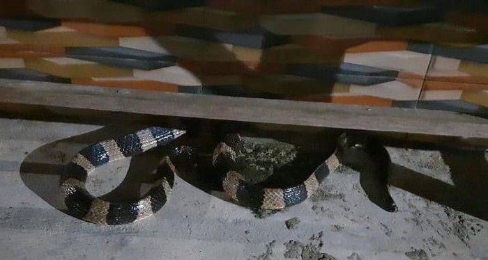Ular tersebut ditemukan di rumah Kuslan, warga Dusun Kedangean, Desa Surabayan, Kecamatan Sukodadi. Ular dengan warna belang hitam dan putih itu diketahui pertama kali di kolong kursi teras.