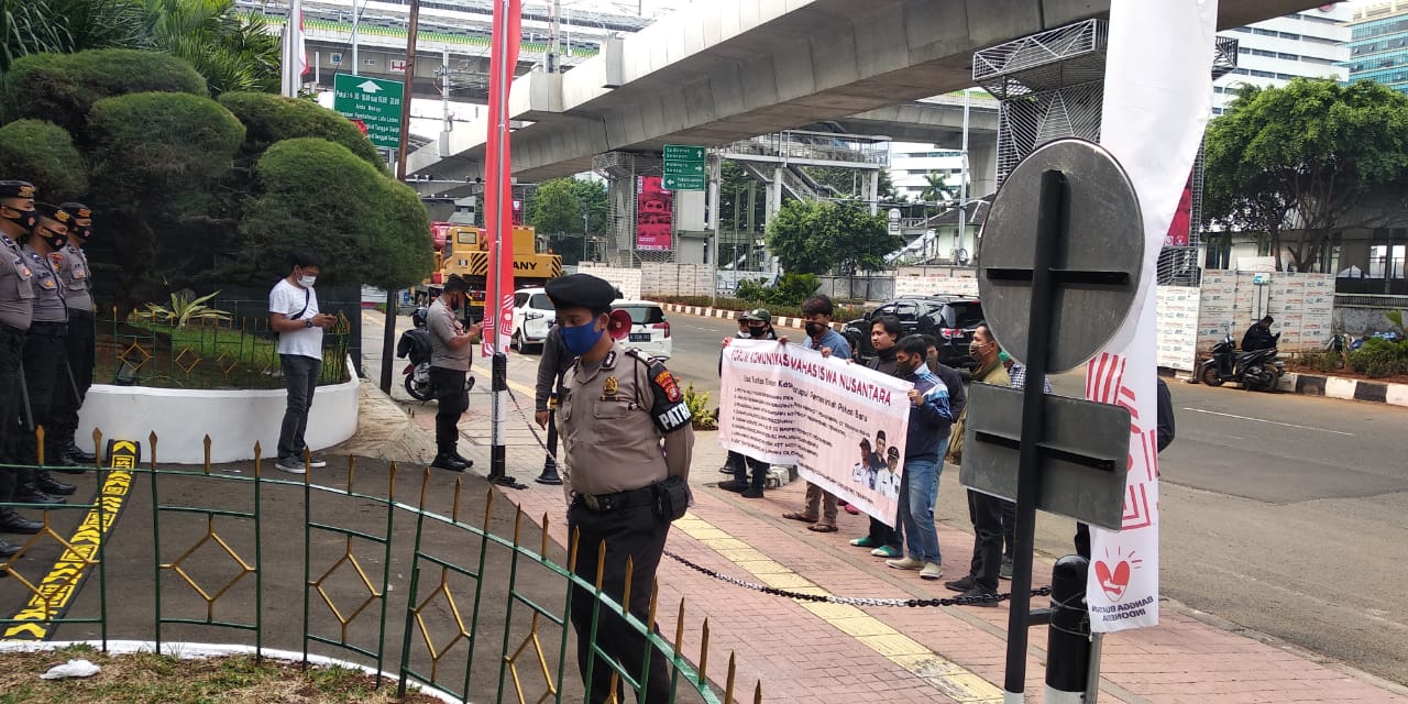 JAKARTA – Sejumlah mahasiswa yang menamakan dirinya Forum Komunikasi Mahasiswa Nusantara (FKMN), Kamis (30/7/2020), menggelar aksi unjuk rasa di Gedung Kejaksaan Agung, di Jakarta. Mereka mendesak KPK dan Kejaksaan Agung mengusut tuntas dugaan korupsi pengadaan lahan Perkantoran Pemerintah Kota Pekanbaru di Tenayan Raya.