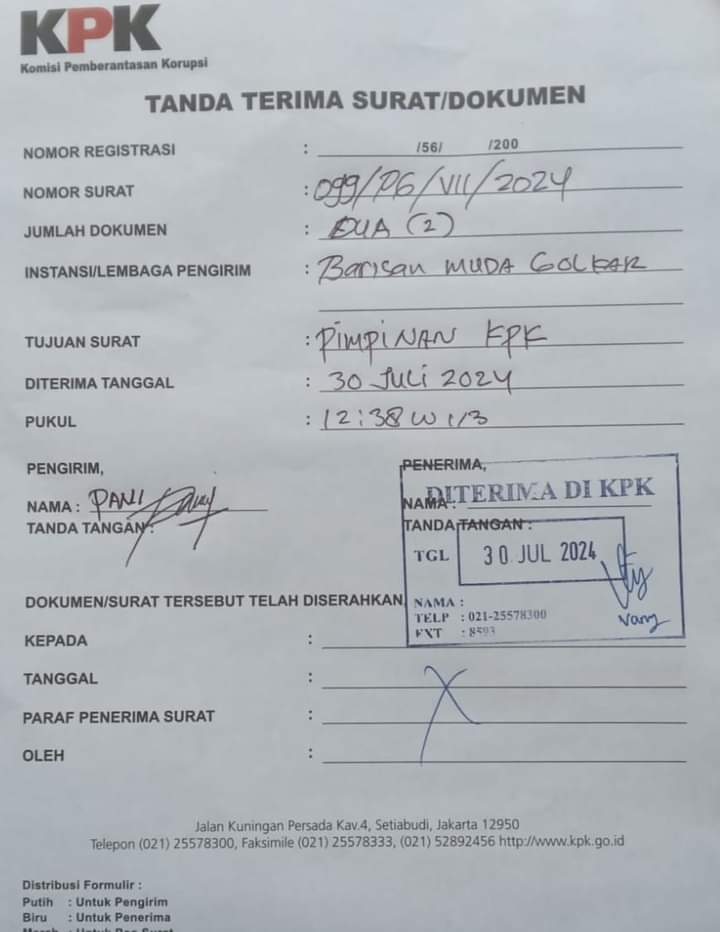 Permintaan itu disampaikan Kordinator Barisan Muda Golkar, Jimmy, saat melaporkan Pj Gubri SF Hariyanto ke gedung KPK, Selasa (30/7/2024).