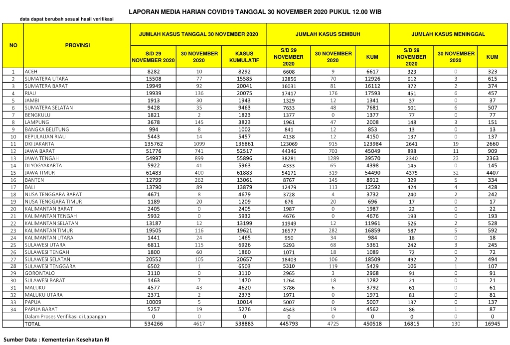 PEKANBARU – Kasus positif virus Corona (Covid-19) di Indonesia, Senin (30/11/2020), bertambah 4.617 orang. Dengan penambahan tersebut, total kasus positif virus Corona di Indonesia menjadi 538.883 orang.