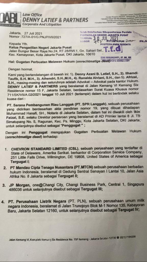 PEKANBARU – PT. Sarana Pembangunan Riau (SPR) Langgak telah melayangkan gugatan perbuatan melawan hukum terhadap Chevron Standard Limited (CSL) sebagai Tergugat 1, PT. MCTN sebagai Tergugat 2, JP Morgan sebagai Tergugat 3, dan PT. PLN (Persero) sebagai Tergugat 4.