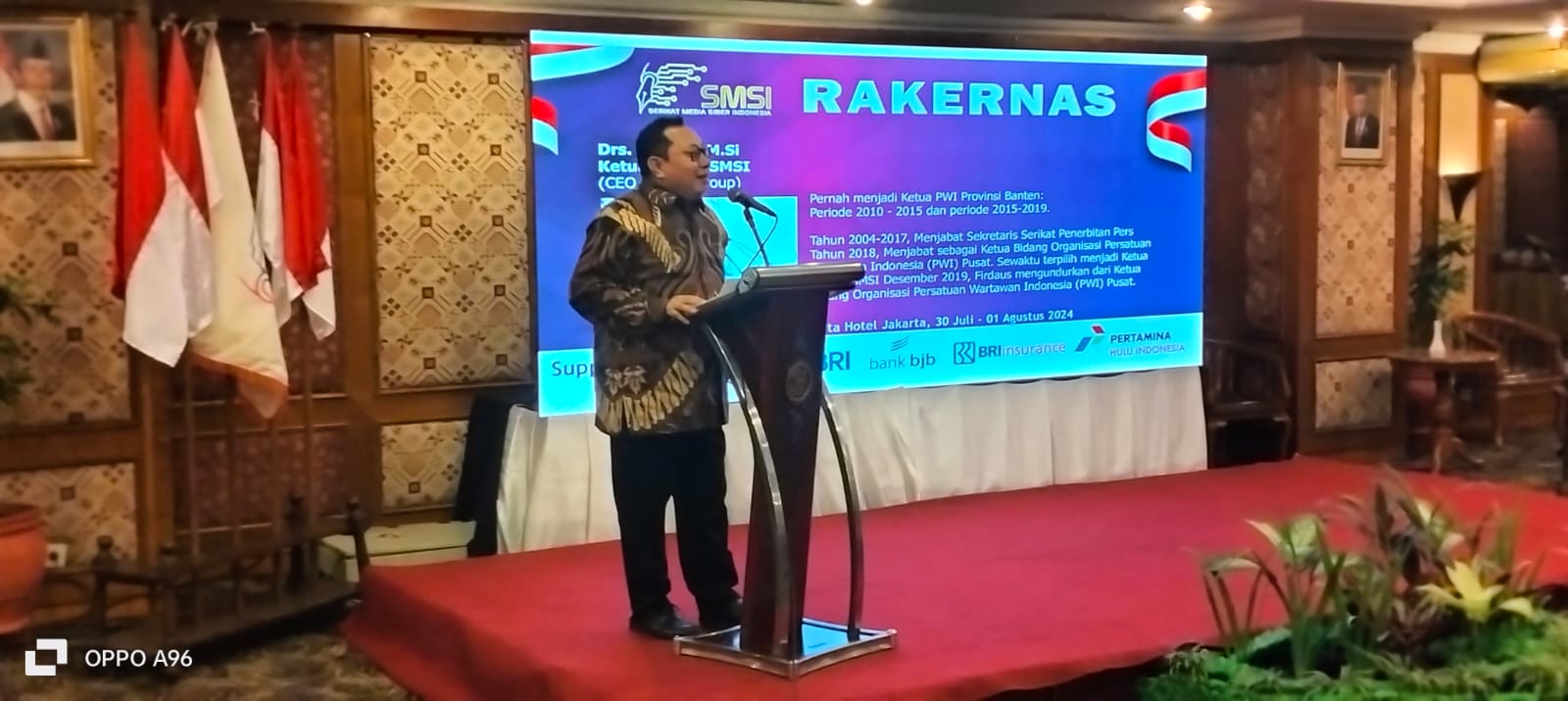 Tampak hadir saat pembukaan Rakernas SMSI para ketua konstituen Dewan Pers, antara lain Plt Ketua Umum PWI Pusat, Zulmansyah Sekedang, dan Ketua Dewan Kehormatan PWI Pusat, Sasongko Tedjo.