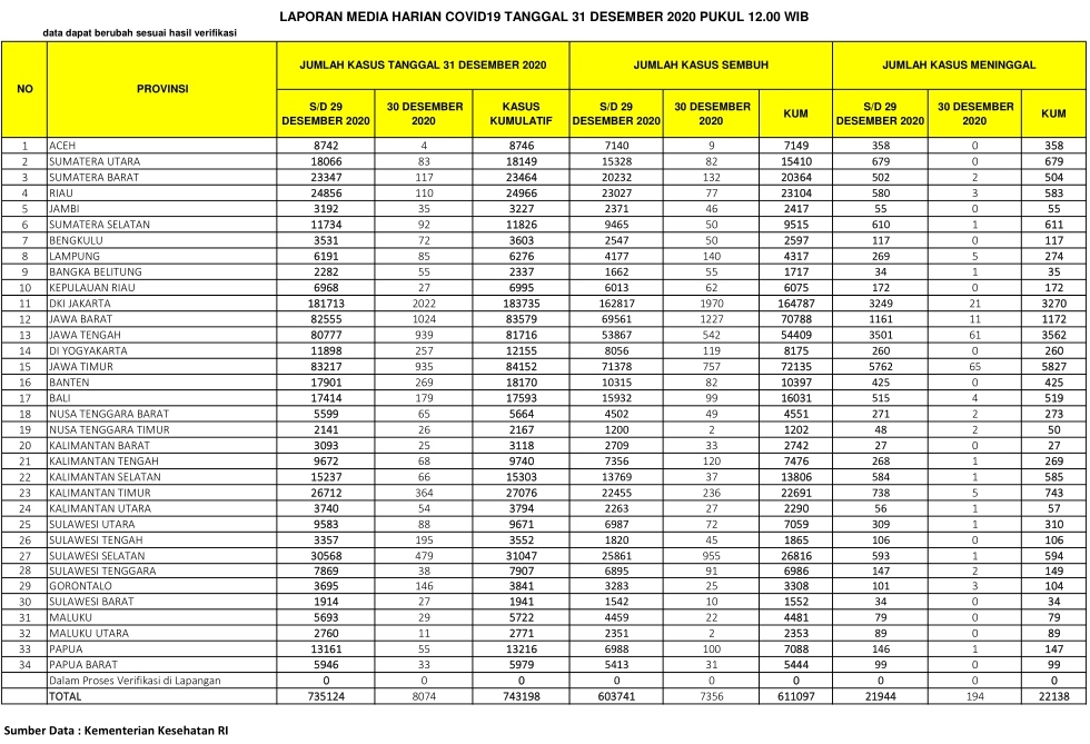 PEKANBARU – Kasus positif virus Corona (Covid-19) di Republik Indonesia (RI), Kamis   (31/12/2020), bertambah 8.074 orang. Dengan penambahan tersebut, total kasus positif virus Corona di Indonesia menjadi 743.198 orang.