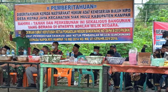 PEKANBARU – Ratusan masyarakat hukum adat Kenegerian Buluh Nipis Desa Kepau Jaya, Kecamatan Siak Hulu, Kabupaten Kampar, Provinsi Riau, Ahad (6/2/2022), melakukan