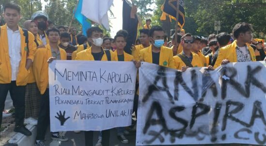 PEKANBARU – Seratusan mahasiswa Universitas Lancang Kuning (Unilak) Pekanbaru melakukan aksi unjuk rasa di depan Mapolda Riau Jalan Pattimura Pekanbaru, Rabu (12/10/2022).