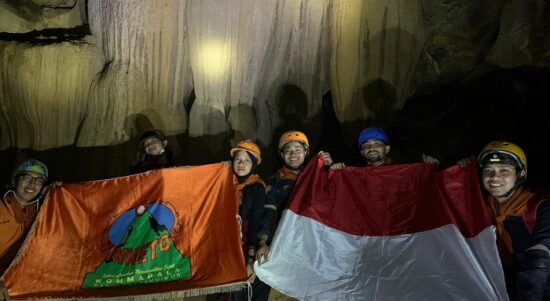 ROKAN HULU – Komando Mahasiswa Pecinta Alam (Kommapala) Winnetou Fakultas Teknik Universitas Riau (Unri) mengibarkan bendera Merah Putih di dalam perut bumi