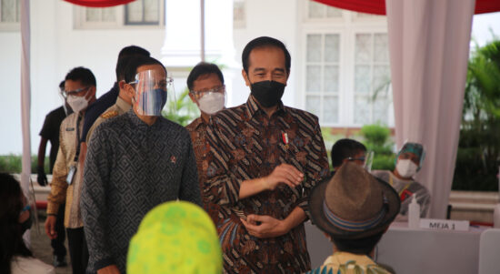 Jakarta – Presiden RI Joko Widodo di dampingi Menteri Kementerian Pendidikan dan Kebudayaan (Mendikbud), Nadiem Anwar Makarim dalam giat pemberian vaksinasi tahap