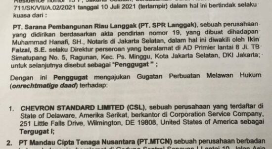 PEKANBARU – PT. Sarana Pembangunan Riau (SPR) Langgak telah melayangkan gugatan perbuatan melawan hukum terhadap Chevron Standard Limited (CSL) sebagai Tergugat 1,