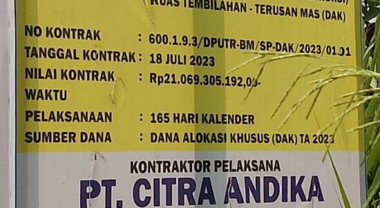 TEMBILAHAN – Proyek Rekonstruksi Jalan Penanganan Long Segment (Pemeliharaan Rutin, Pemeliharaan Berkala, Peningkatan/Rekonstruksi) Ruas Tembilahan–Terusan Mas (DAK) senilai Rp21 miliar lebih, terancam