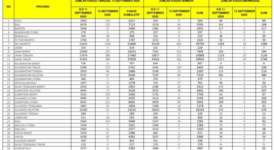 PEKANBARU – Kasus positif virus Corona (Covid-19) di Indonesia hari ini, Sabtu (12/9/2020), bertambah 3.806 orang. Dengan penambahan tersebut, total kasus positif virus Corona